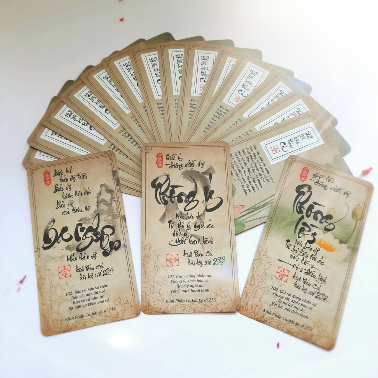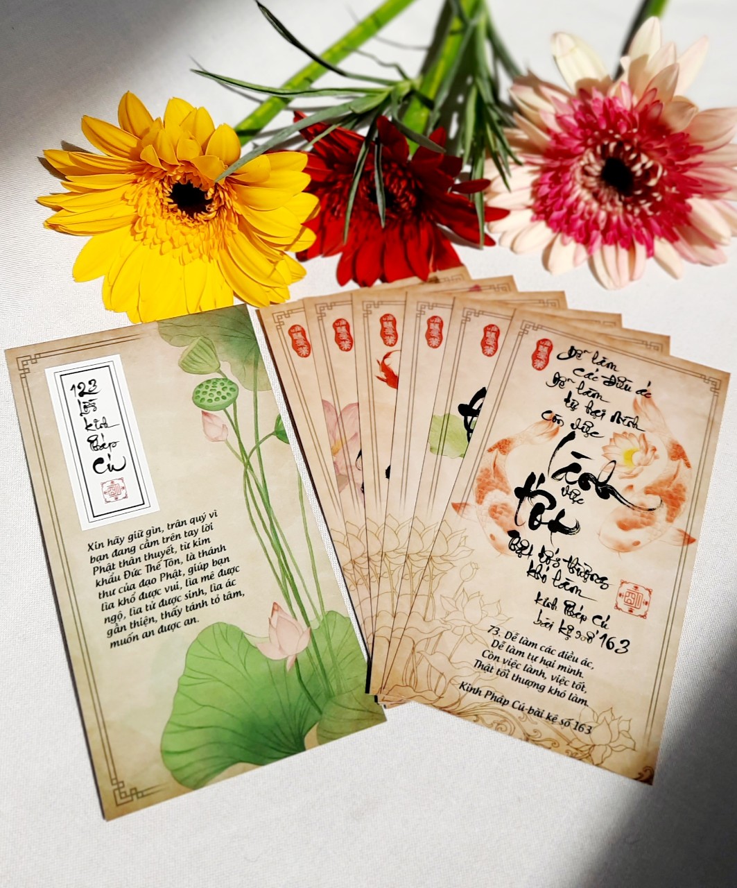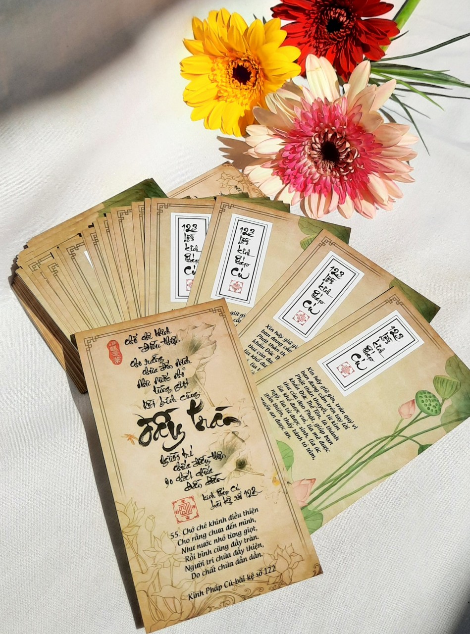 xin nói rõ hơn là bộ 123 LỜI KINH PHÁP CÚ kích thước 7x13 cm lớn hơn bộ LỜI HIỀN THIỆN 6.7x10 cm, màu sáng hơn, chữ bên dưới to hơn để dễ đọc.
