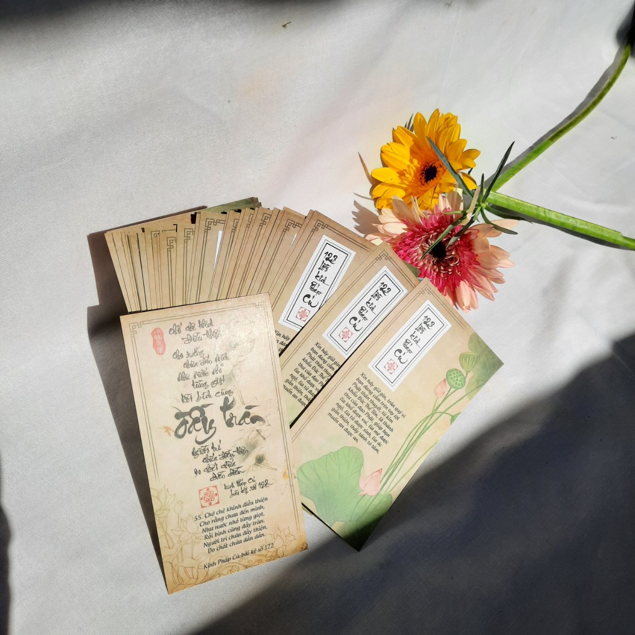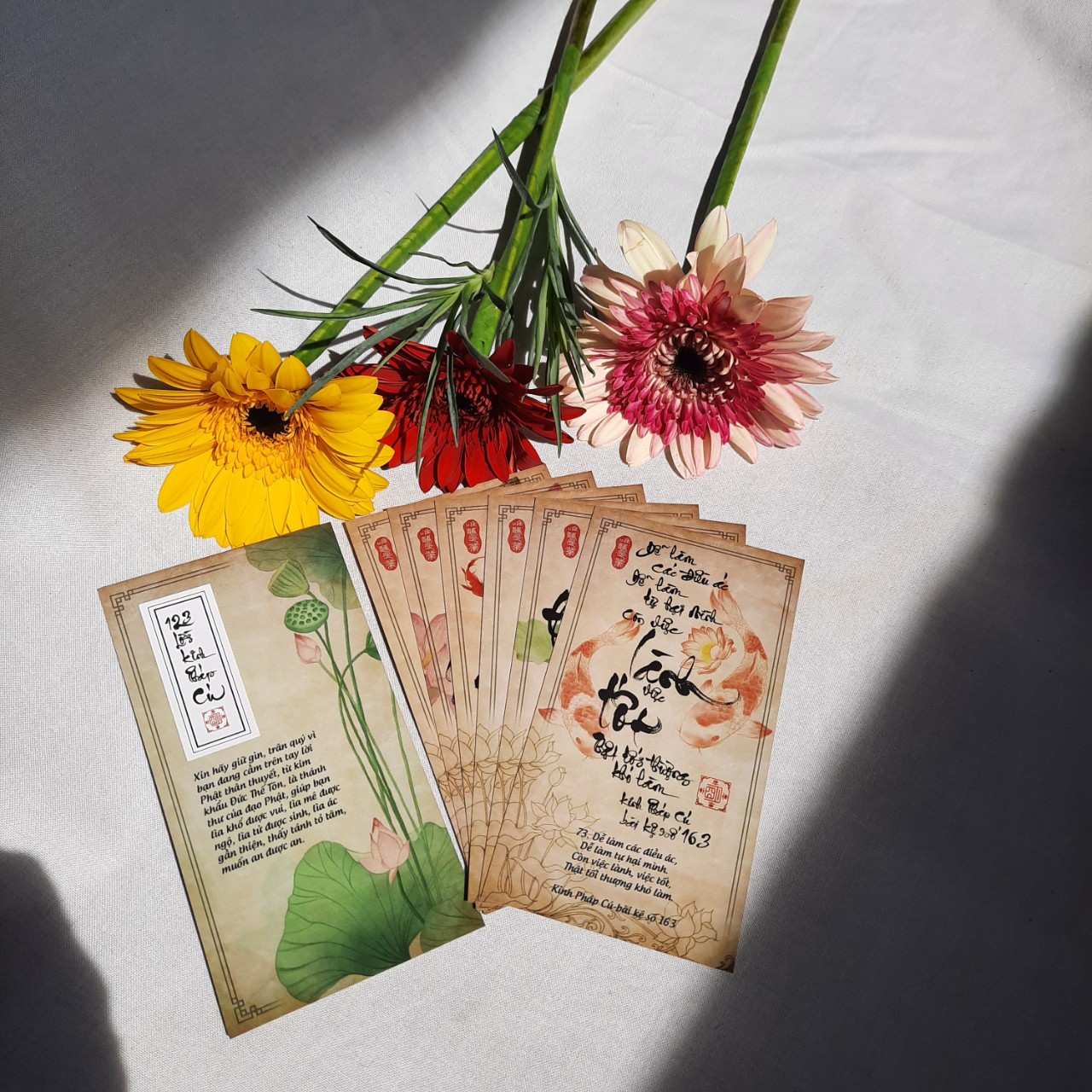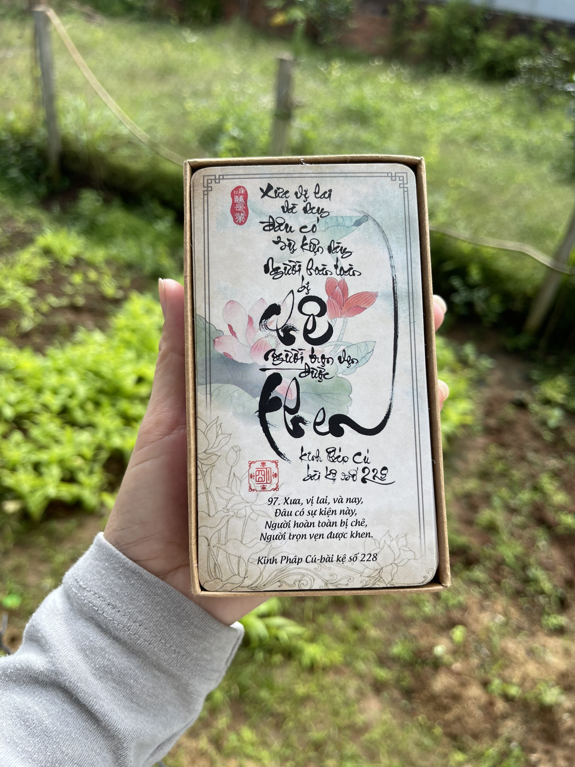 xin nói rõ hơn là bộ 123 LỜI KINH PHÁP CÚ kích thước 7x13 cm lớn hơn bộ LỜI HIỀN THIỆN 6.7x10 cm, màu sáng hơn, chữ bên dưới to hơn để dễ đọc.