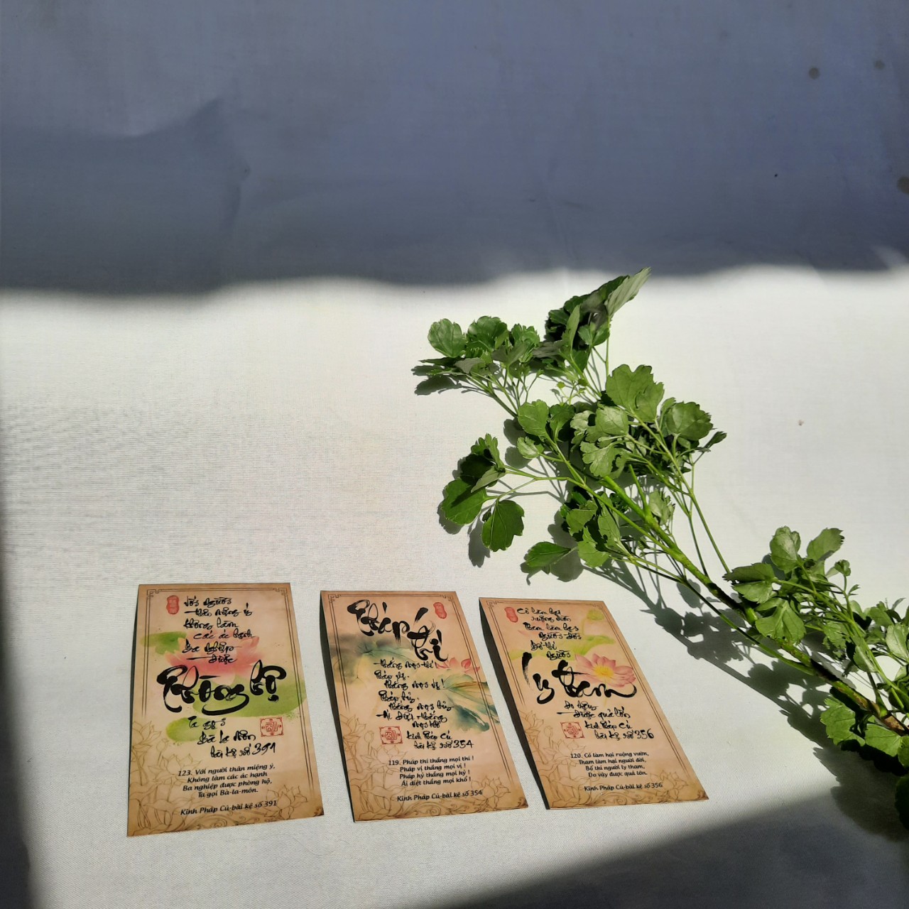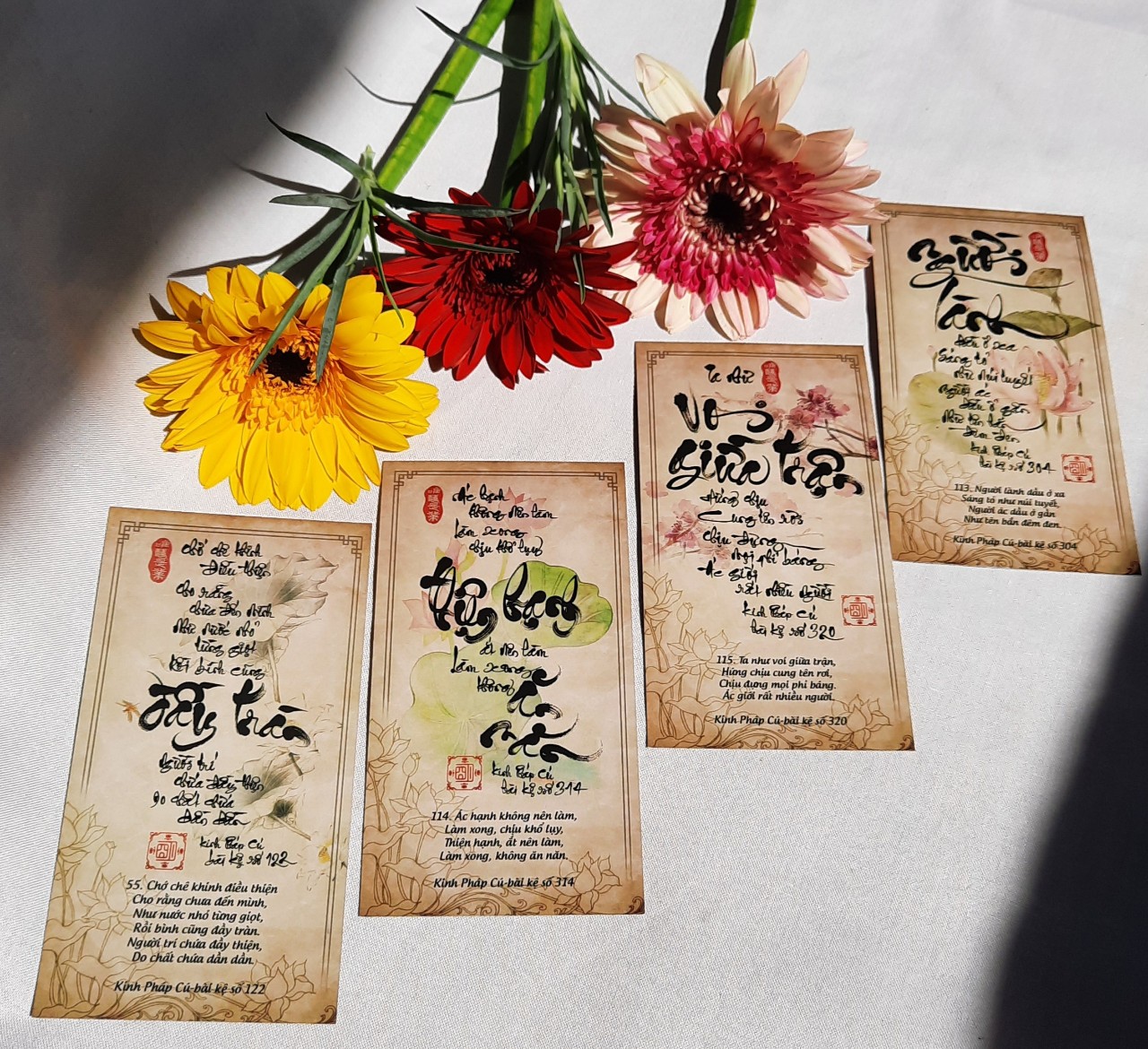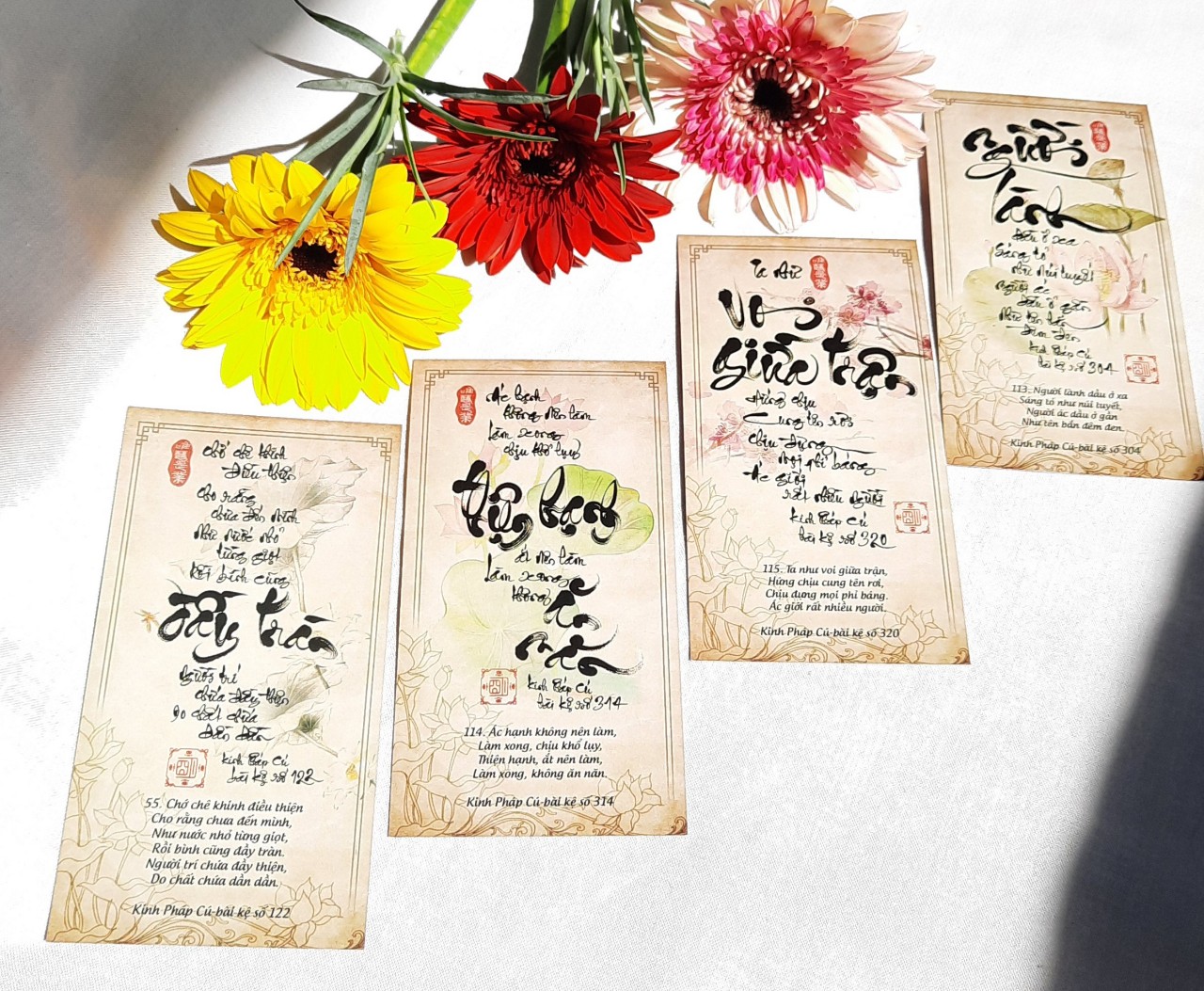 Bộ 123 LỜI KINH PHÁP CÚ, là tập hợp 123/423 lời Kinh Pháp Cú được viết bằng chữ thư pháp, là một phương tiện để các bạn học pháp. Xin nói thêm là Kinh Pháp Cú bao gồm 423 bài kệ, 26 phẩm, tóm thâu tinh hoa giáo lý đức PHẬT, nhiều bài kệ đã trở thành những lời dạy chính đức PHẬT thân thuyết, và đọc những bài kệ này, chúng ta cảm thân nghe chính lời PHẬT dạy từ hơn 2.500 năm vang lại. Giá trị bất hủ của tập Dhammapada là ở chỗ này và chúng ta cảm thấy không còn sự trung gian của các vị TỔ sư kiết tập kinh điển, và là bản kinh được các vị Sa Di các nước theo Phật Giáo Nam Tông học thuộc lòng khi bước chân vào đời sống tu hành, một bài kinh có thể xem là chứa đựng một cách súc tích và trung thành nhất của lời dạy nguyên thủy của đức Phật.