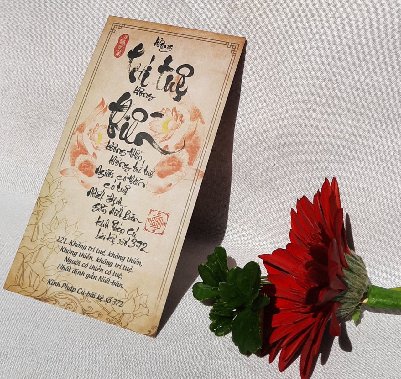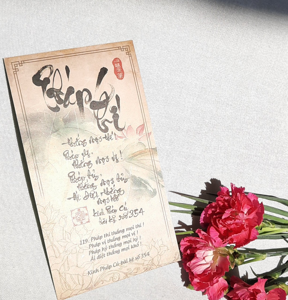 Vì là kinh Phật được viết với lòng tri ân Phật, tri ân Pháp, tri ân Tăng, nên chúng tôi có ghi chú ở mặt sau mỗi lá là "xin hãy giữ gìn, trân quý vì bạn đang cầm trên tay lời Phật thân thuyết, từ kim khẩu Đức Thế Tôn, là thánh thư của đạo Phật, giúp bạn lìa khổ được vui, lìa mê được ngộ, lìa chết được sống, lìa ác gần thiện, thấy tánh tỏ tâm."