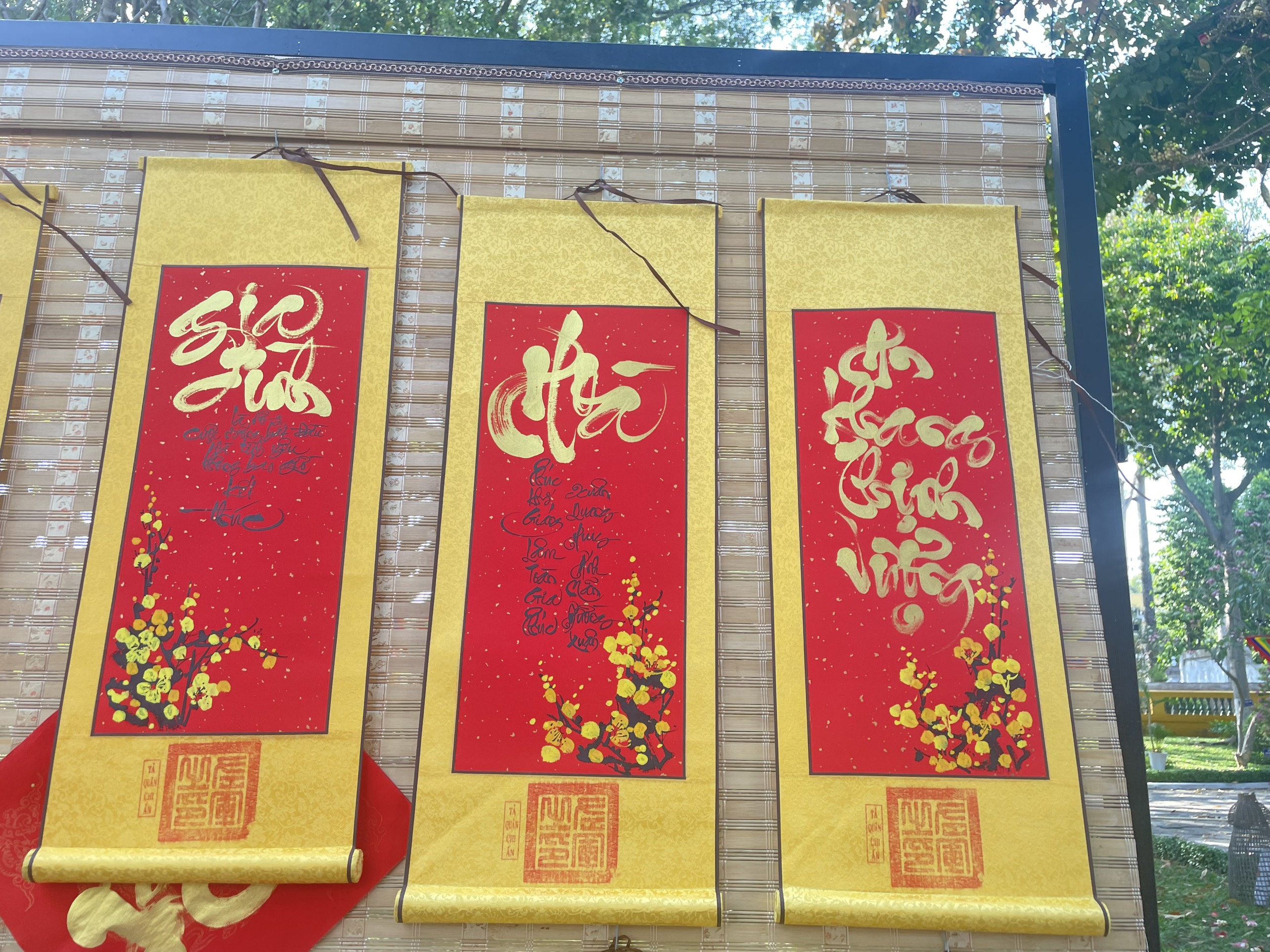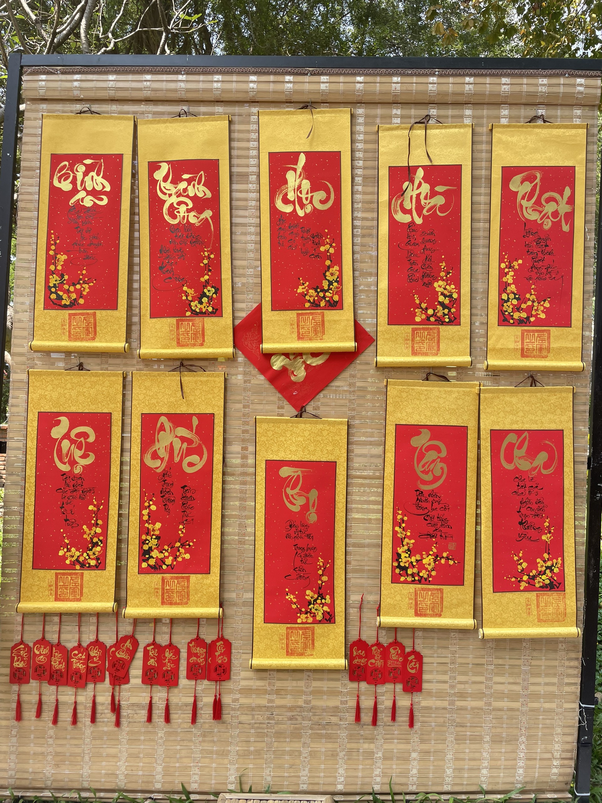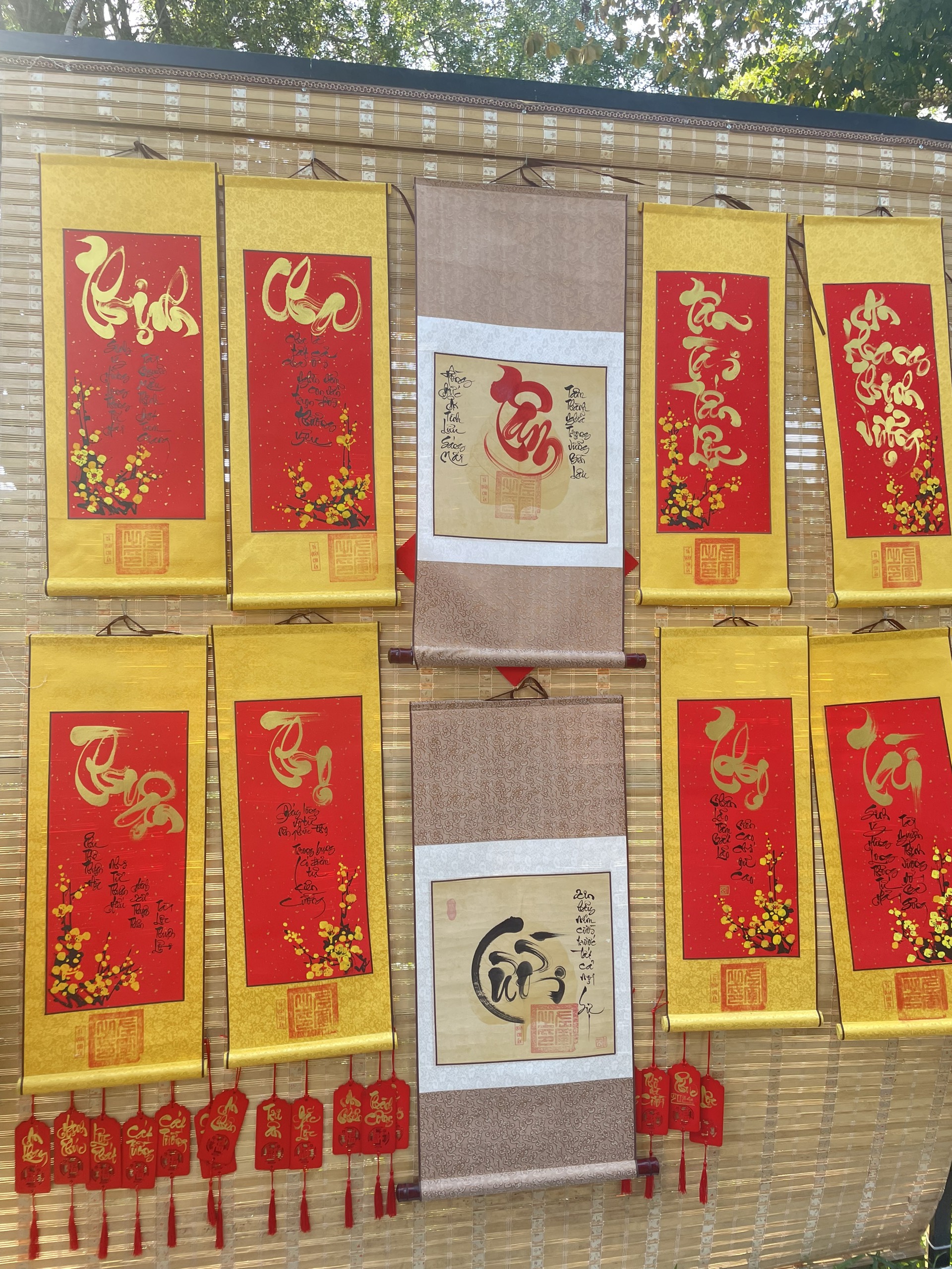 ngoài ra còn có nền khác như Chất liệu: giấy xuyến chỉ bo lụa cao cấp, hoa Sen, Mai, Đào, Cát Tường, Mẫu Đơn, Trúc. kích thước 30x80 cm, nền trắng, nền đỏ vẽ hoa mai.
