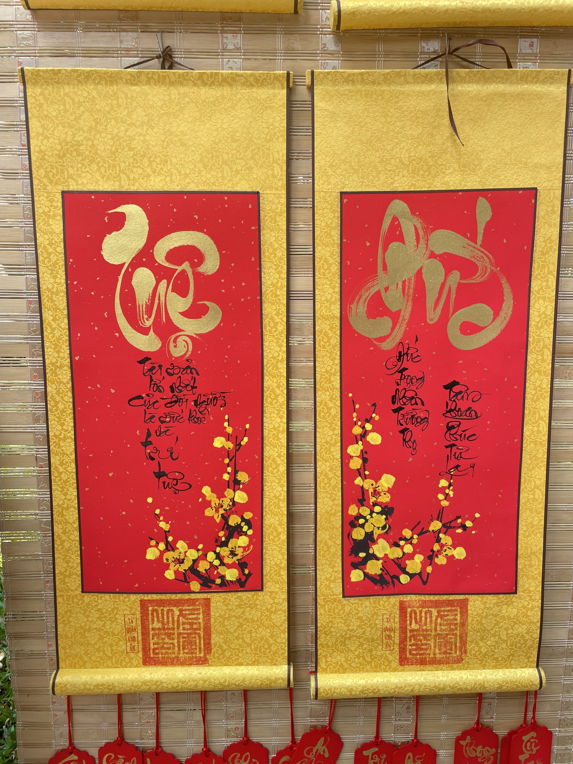 Chất liệu: giấy xuyến chỉ bo lụa cao cấp, hoa Sen, Mai, Đào, Cát Tường, Mẫu Đơn, Trúc. kích thước 30x80 cm, nền trắng, nền đỏ vẽ hoa mai.