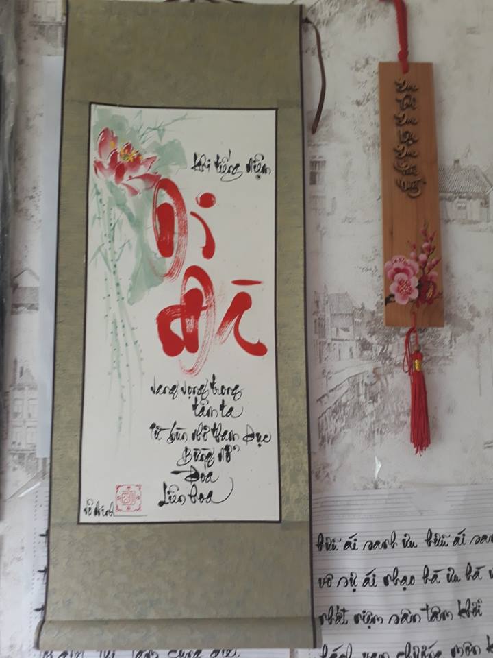 ngoài ra còn có nền khác như Chất liệu: giấy xuyến chỉ bo lụa cao cấp, hoa Sen, Mai, Đào, Cát Tường, Mẫu Đơn, Trúc. kích thước 30x80 cm, nền trắng, nền đỏ vẽ hoa mai.