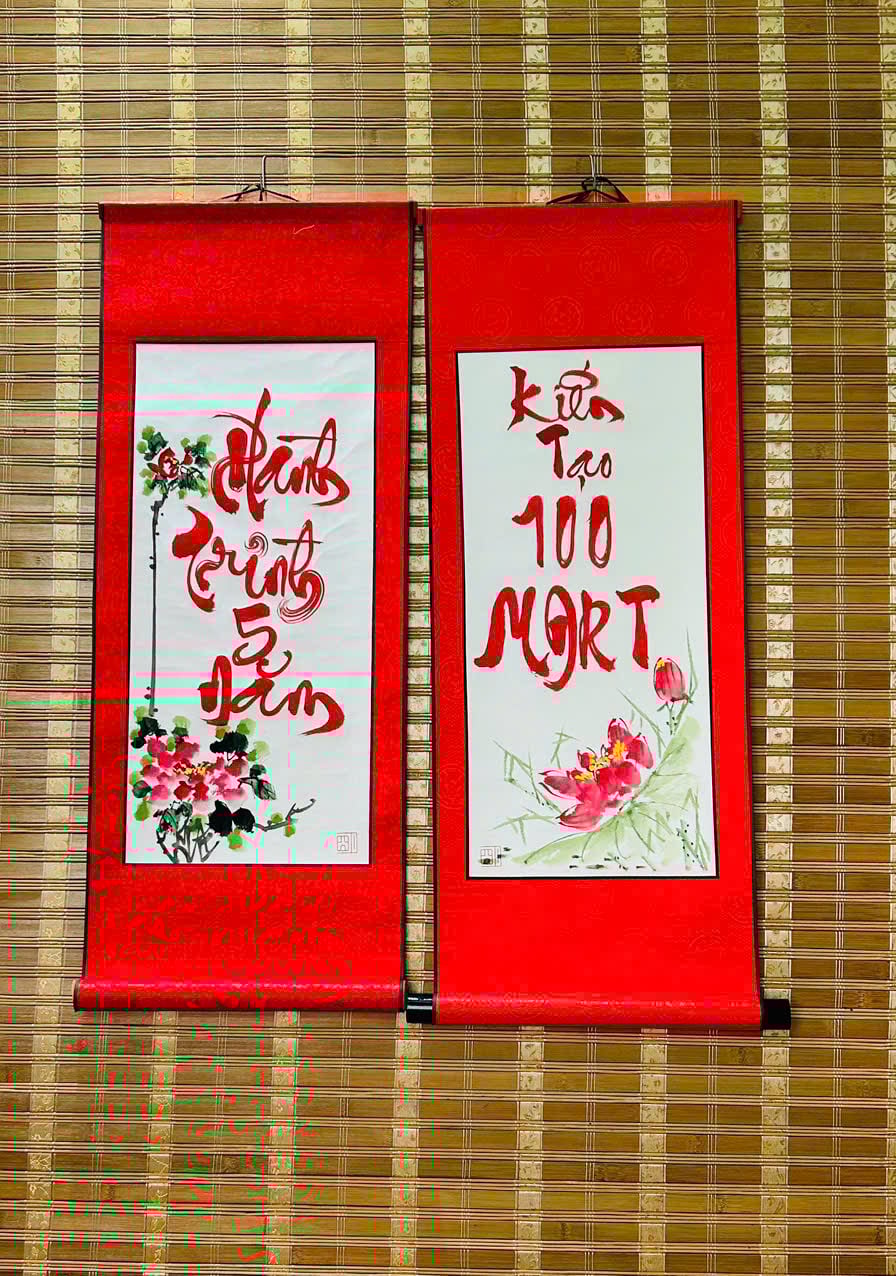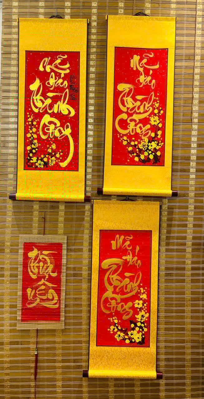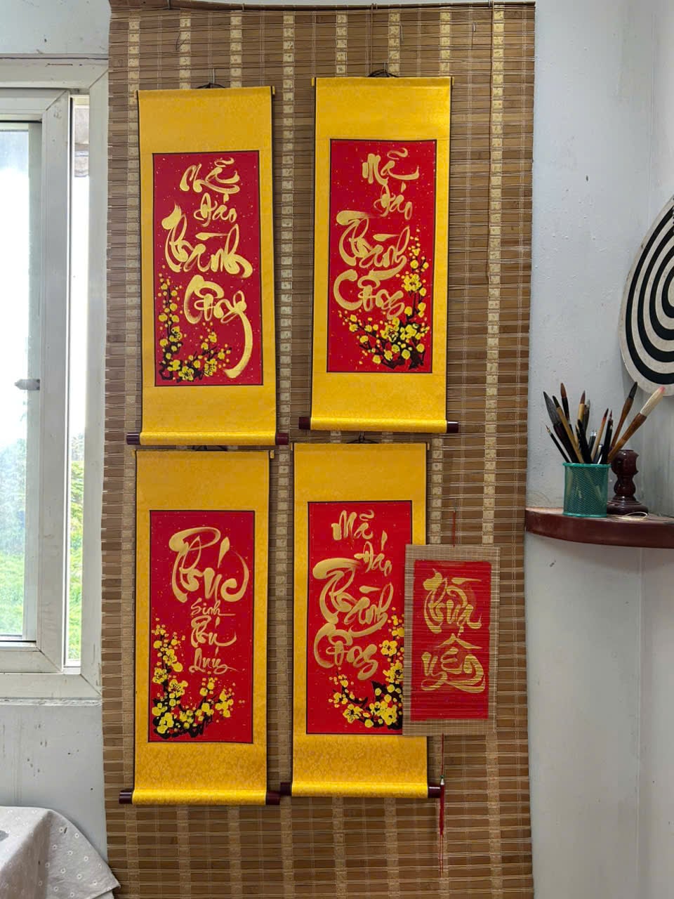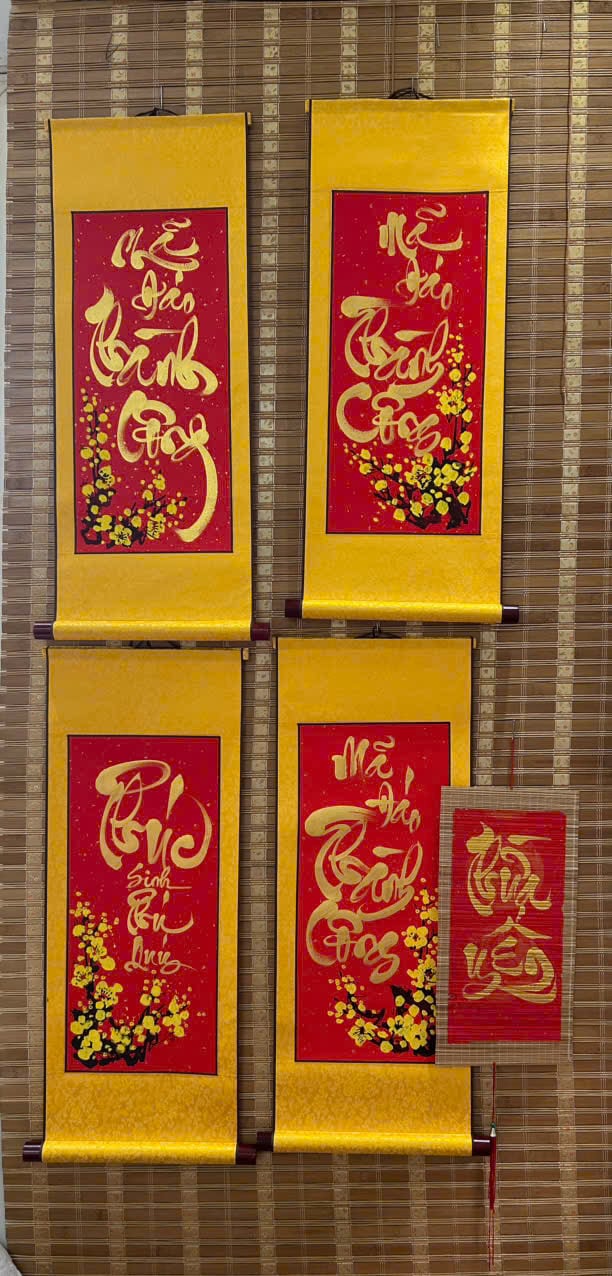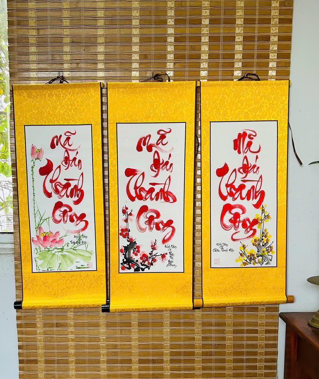 • Nền Vẽ Tay: Mỗi bức liễn là một tác phẩm hội họa thu nhỏ với các chủ đề: Hoa Sen thanh tịnh, Hoa Mai rực rỡ, hay Nhành Đào đón xuân...
