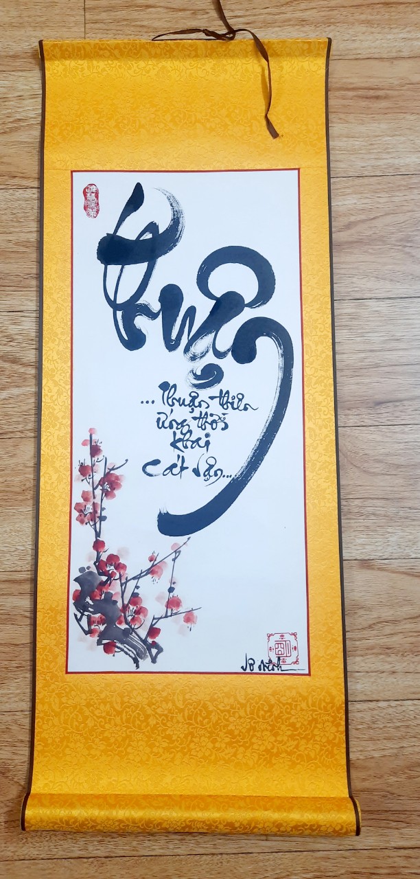ngoài ra còn có nền khác như Chất liệu: giấy xuyến chỉ bo lụa cao cấp, hoa Sen, Mai, Đào, Cát Tường, Mẫu Đơn, Trúc. kích thước 30x80 cm, nền trắng, nền đỏ vẽ hoa mai.