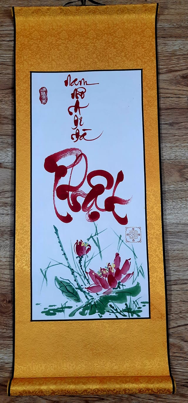 liễn thư pháp chữ Liễn thư pháp chữ Nam Mô A Di Đà Phật nền trắng chữ đỏ NAM MÔ A DI ĐÀ PHẬT, lá bồ đề tặng kèm