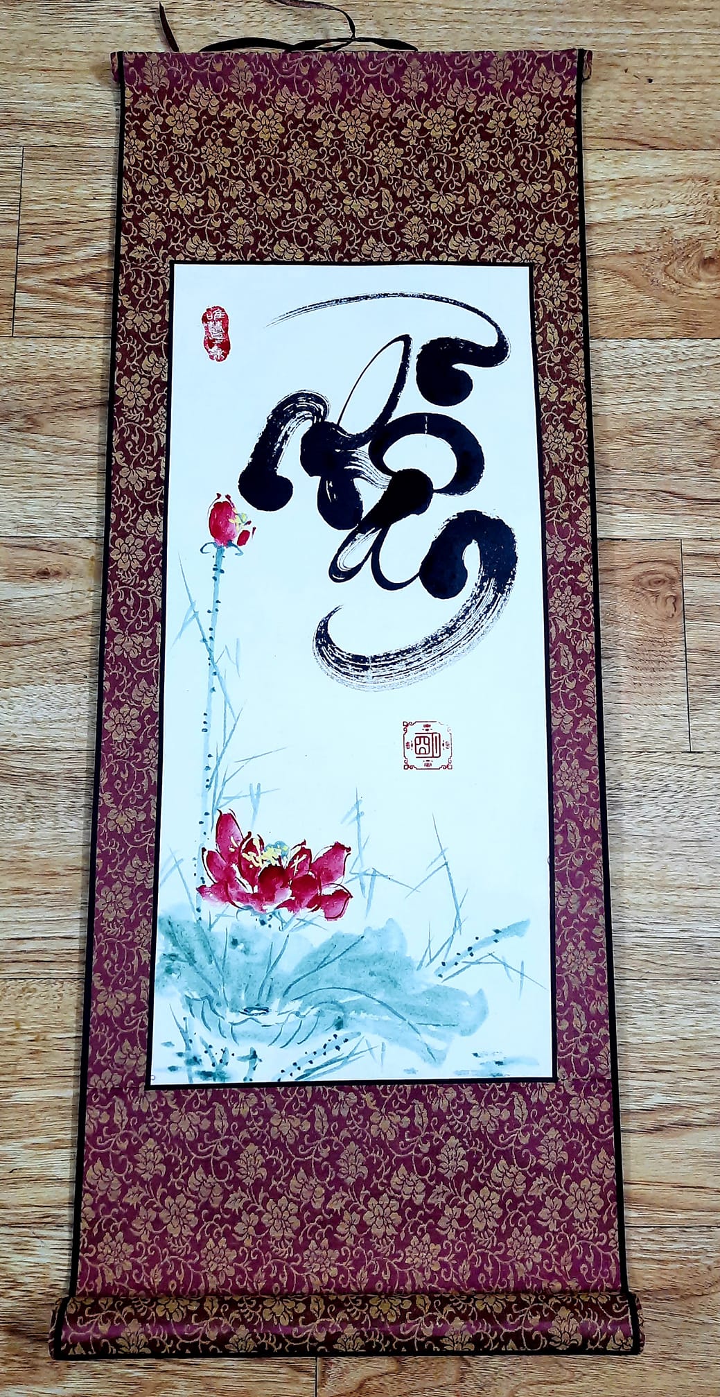Một tác phẩm viết trên nền trằng lụa cao cấp chỉ đơn giản chữ NHẪN trên nền hoa Sen. Đơn giản mà tinh tế.