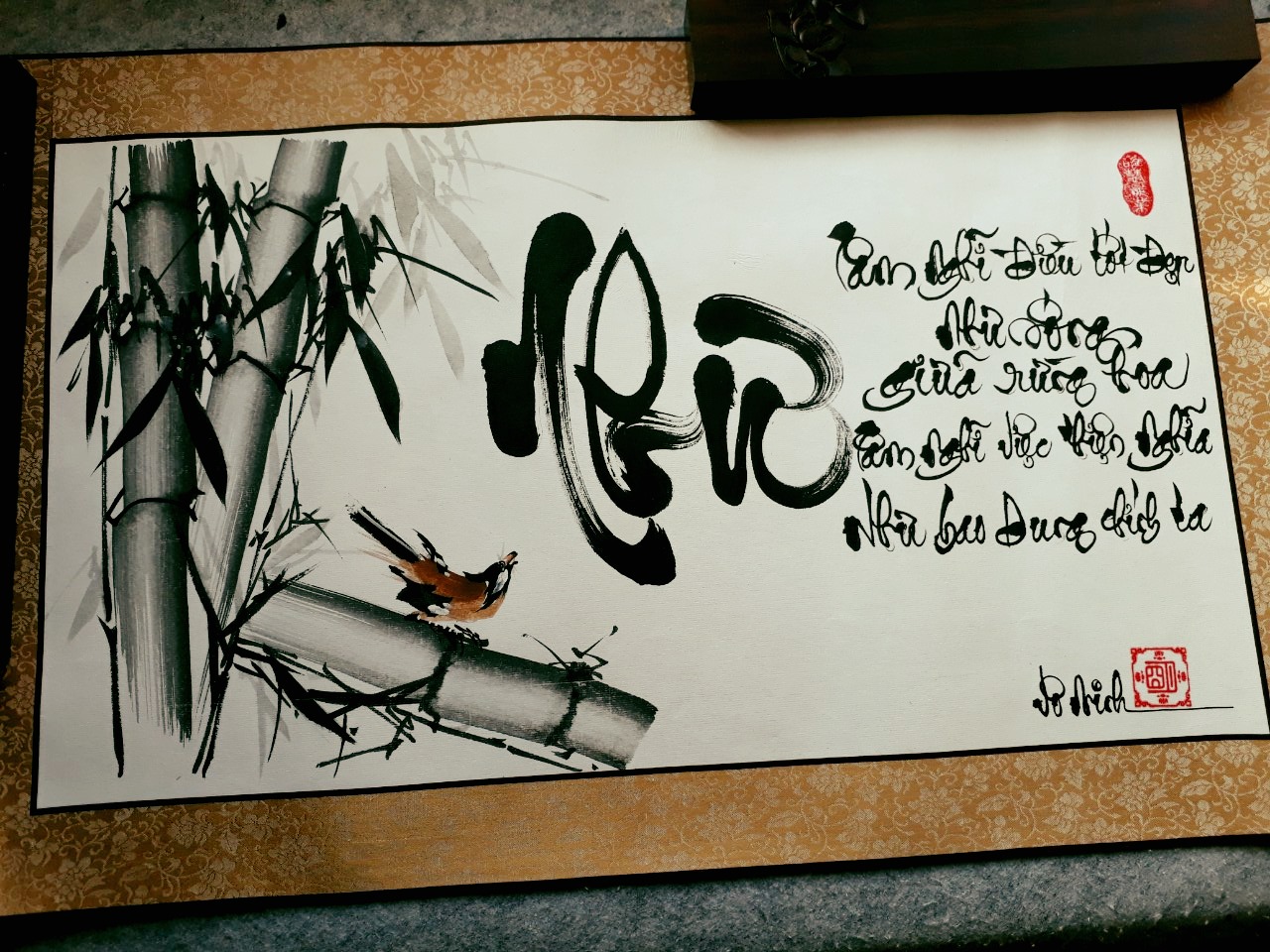 một tác phẩm thư pháp chữ NHƯ viết cho khách viết trên nền trắng, lụa đỏ Chất liệu: giấy xuyến chỉ bo lụa cao cấp, hàng mới, họa Trúc.