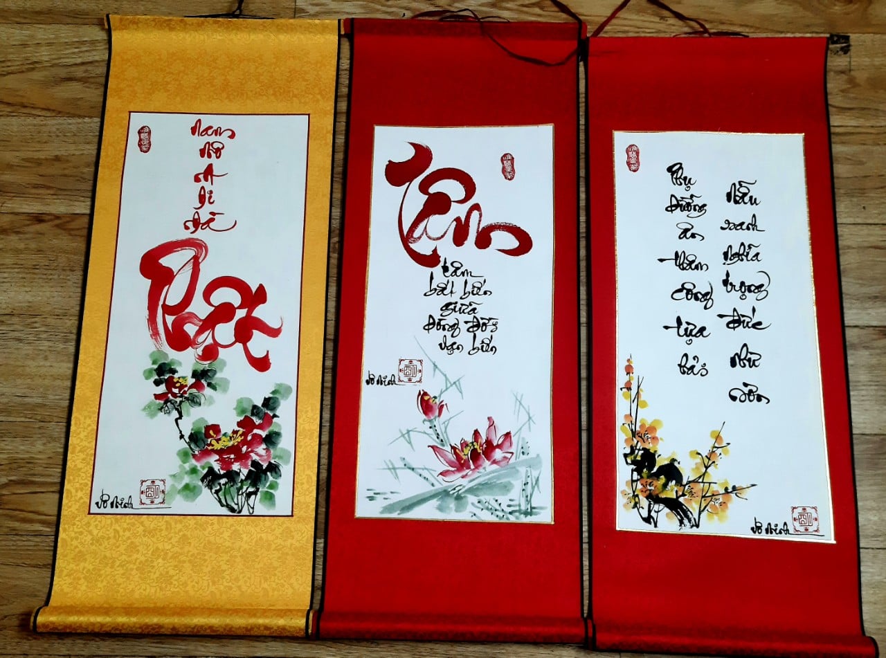 một tác phẩm thư pháp gồm 2 liễn ghi chữ PHẬT, TÂM, và 2 câu đối viết cho khách viết trên nền trắng, lụa đỏ 🌷Chất liệu: giấy xuyến chỉ bo lụa cao cấp, hàng mới nhập về, hoa Sen, Mai, Đào, Cát Tường, Mẫu Đơn, Trúc