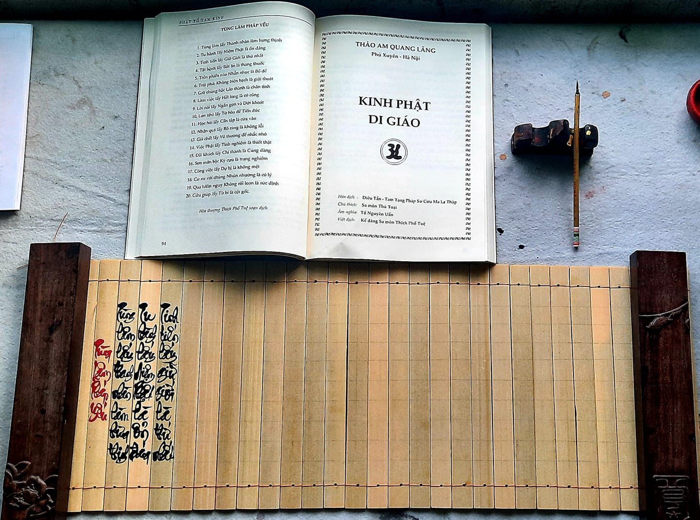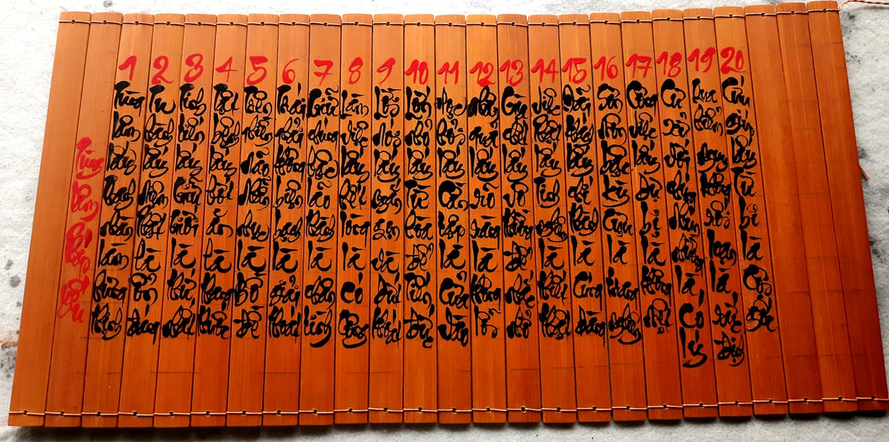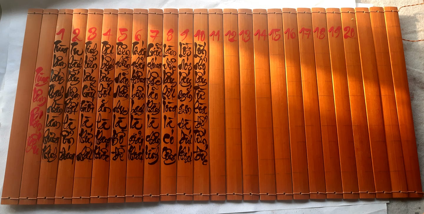 chữ viết bởi VÔ MINH THƯ PHÁP, trên thị trường có bán sách thẻ tre có chữ sẵn với nội dung phong phú như :Trà Kinh , Đại Bi Chú , Tâm Kinh , Binh Pháp Tôn Tử, nhưng VÔ MINH THƯ PHÁP chỉ mua sách thẻ tre không chữ, rồi viết chữ mình lên. Các bạn quan tâm thì đặt hàng VÔ MINH THƯ PHÁP viết, mỗi tác phẩm không quá 200 chữ.