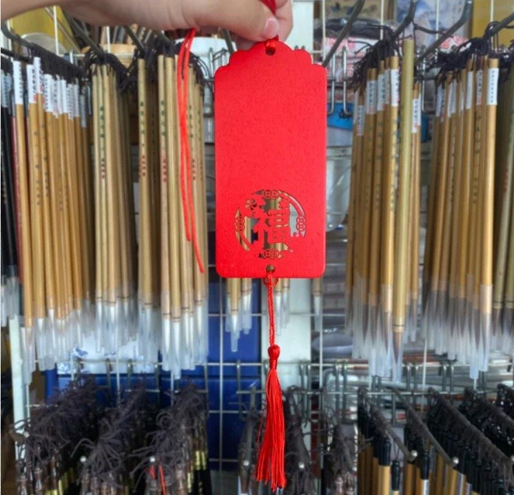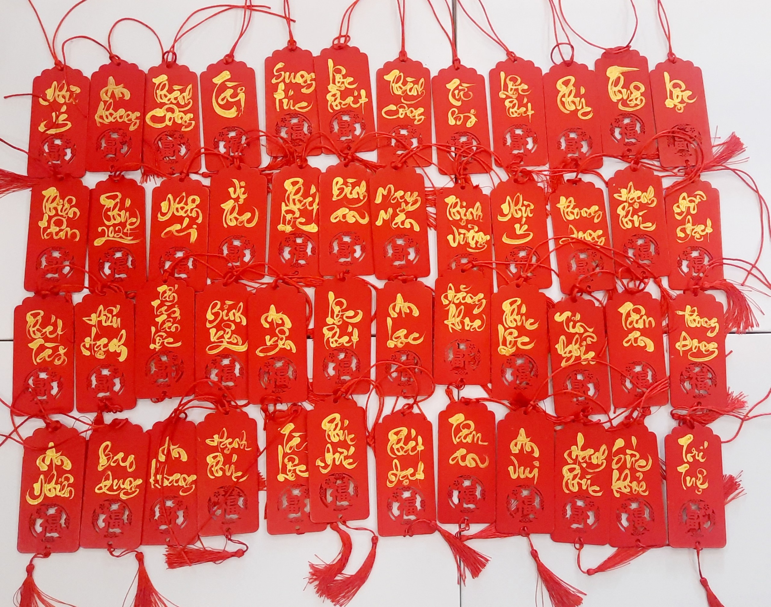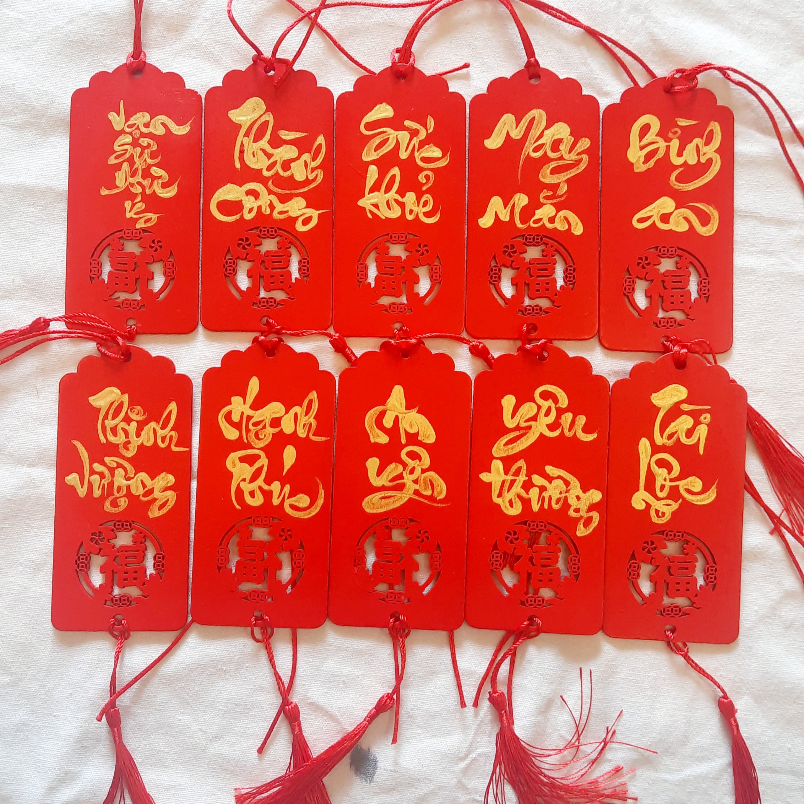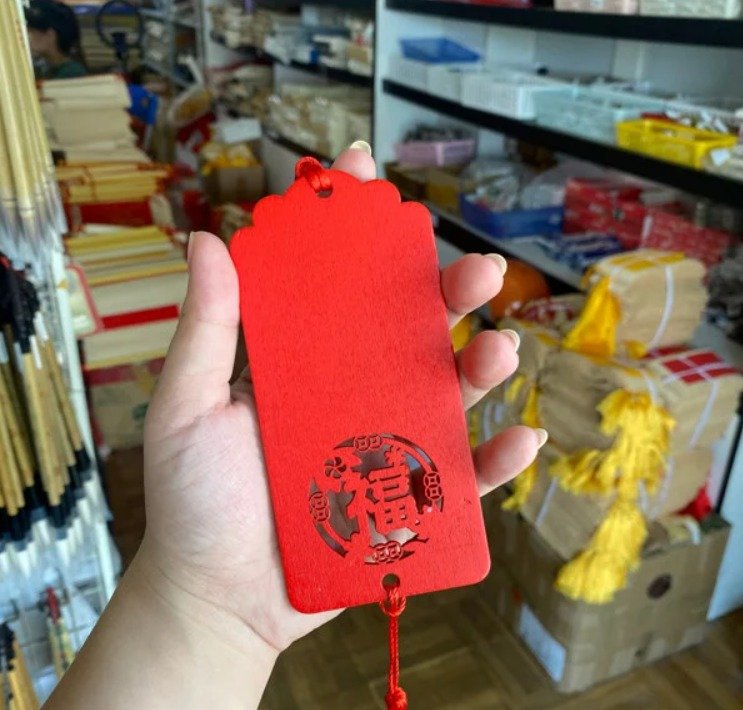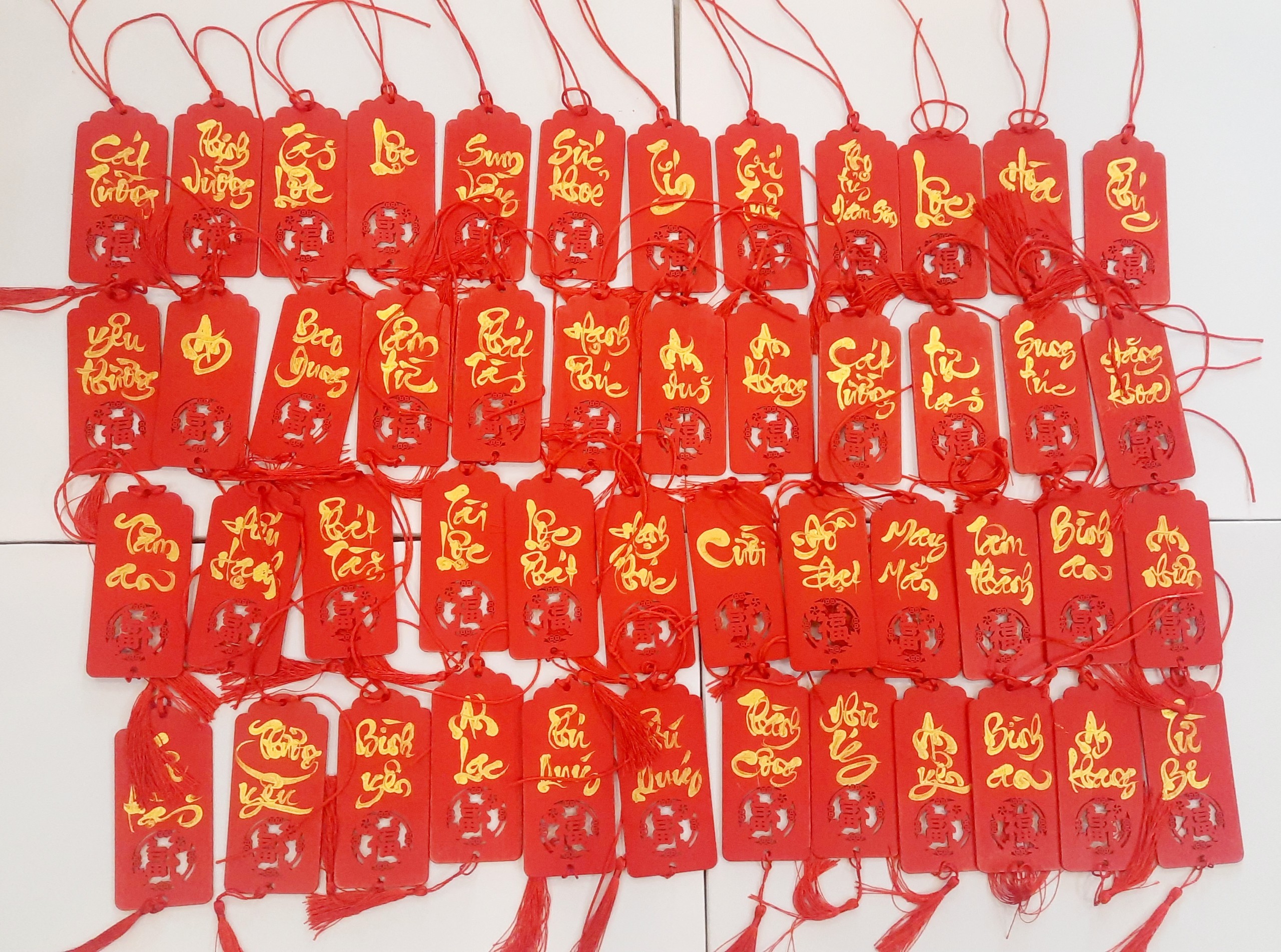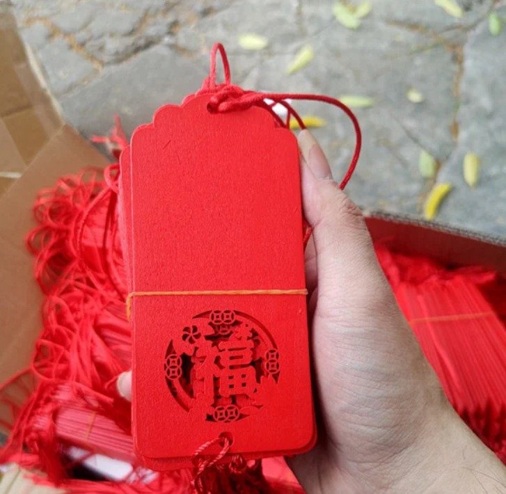 Sản phẩm là thẻ gỗ, bề mặt sơn đỏ, phẳng đều dùng để viết thư pháp. Ưu điểm so với thẻ giấy là có thể treo ngoài trời mà không sợ bị hỏng, độ bền cao hơn so với thẻ giấy. mẫu khắc hoa văn chữ Phúc.