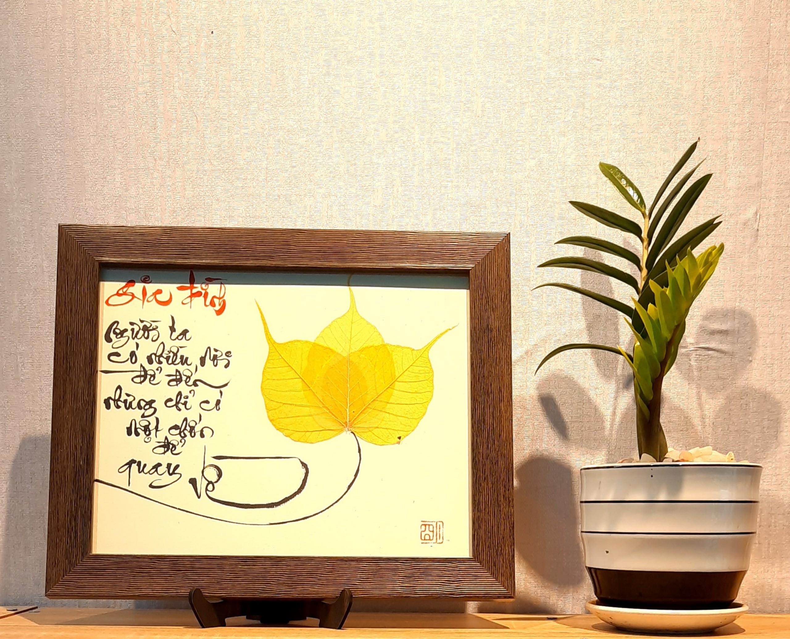 Sự kết hợp giữa thư pháp và lá bồ đề là một món quà ý nghĩa để dành tặng người thân, bạn bè, đối tác, và để trưng bày nơi phòng làm việc, phòng khách, chỗ thờ tự rất đẹp, ý nghĩa