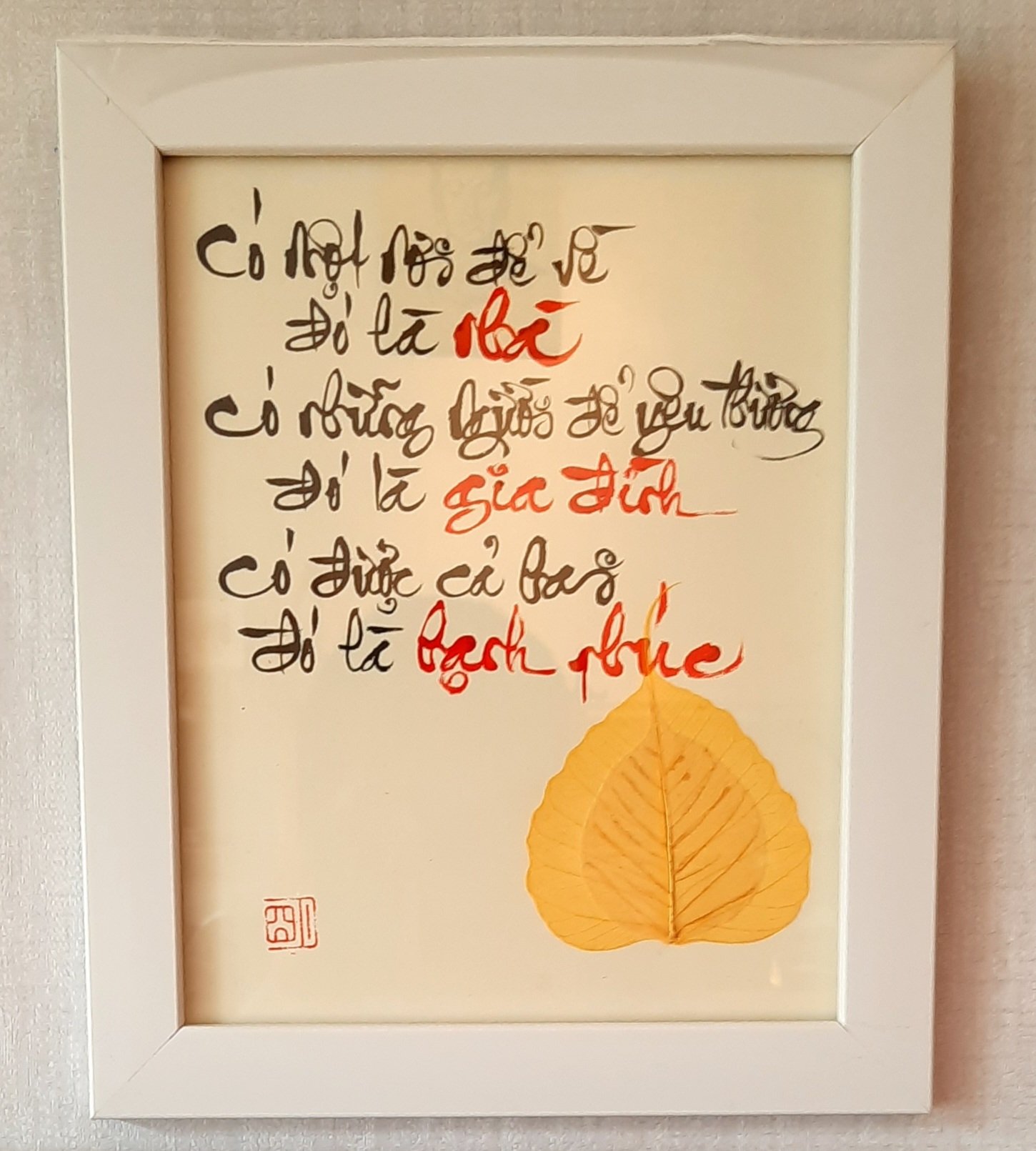 Sự kết hợp giữa thư pháp và lá bồ đề là một món quà ý nghĩa để dành tặng người thân, bạn bè, đối tác, và để trưng bày nơi phòng làm việc, phòng khách, chỗ thờ tự rất đẹp, ý nghĩa