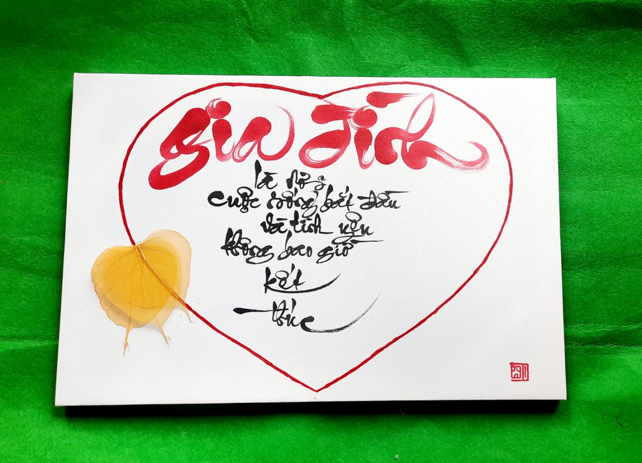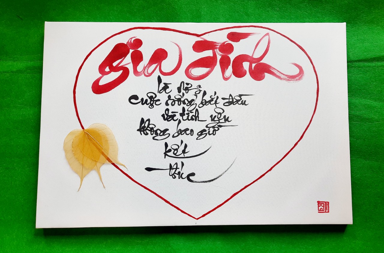 khung canvas, 40x60cm, bằng gỗ, vải canvas, vẽ hình trái tim, lá bồ đề ghi nội dung như trên. .
