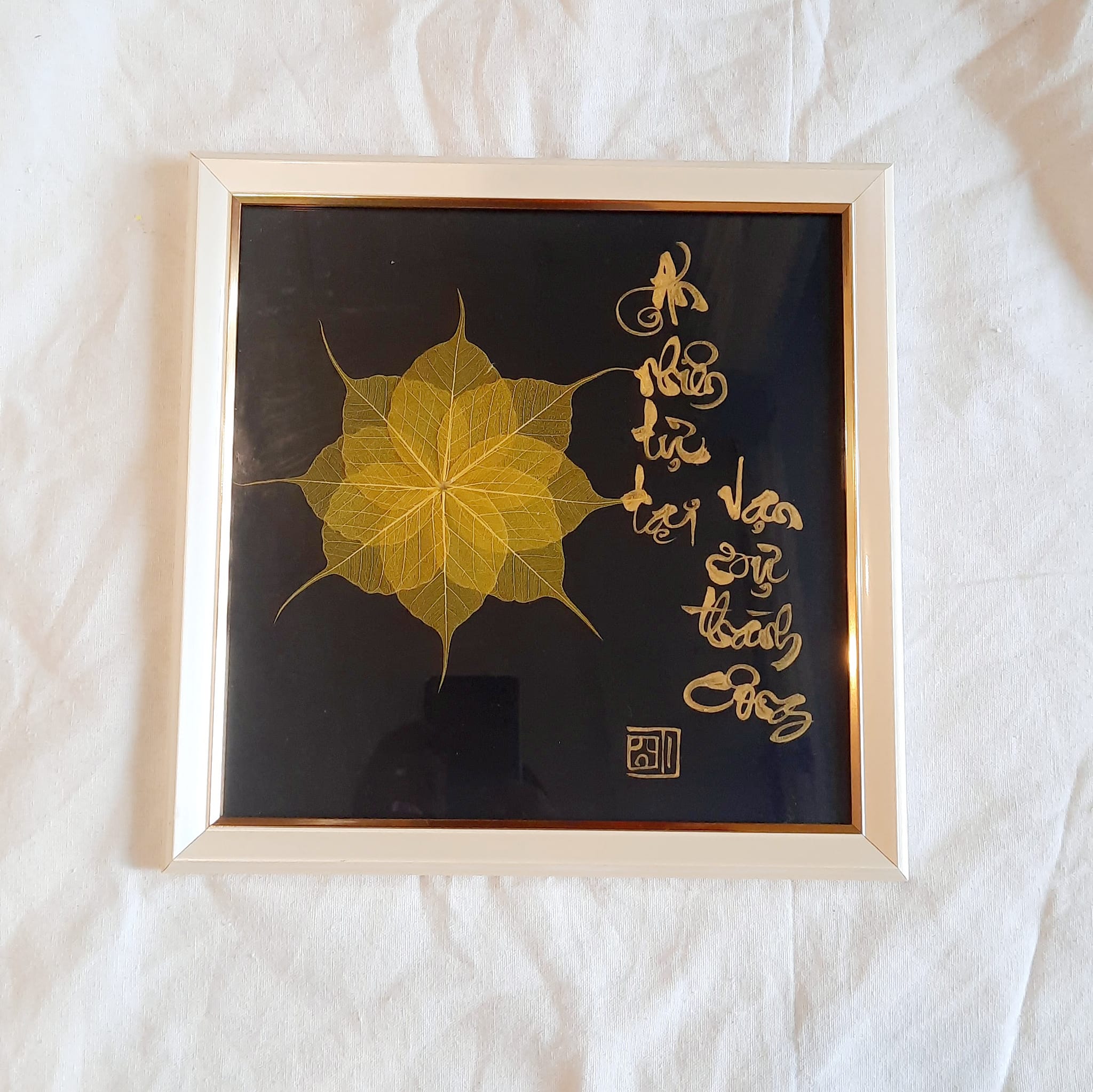Sự kết hợp giữa thư pháp và lá bồ đề là một món quà ý nghĩa để dành tặng người thân, bạn bè, đối tác, và để trưng bày nơi phòng làm việc, phòng khách, chỗ thờ tự rất đẹp, ý nghĩa