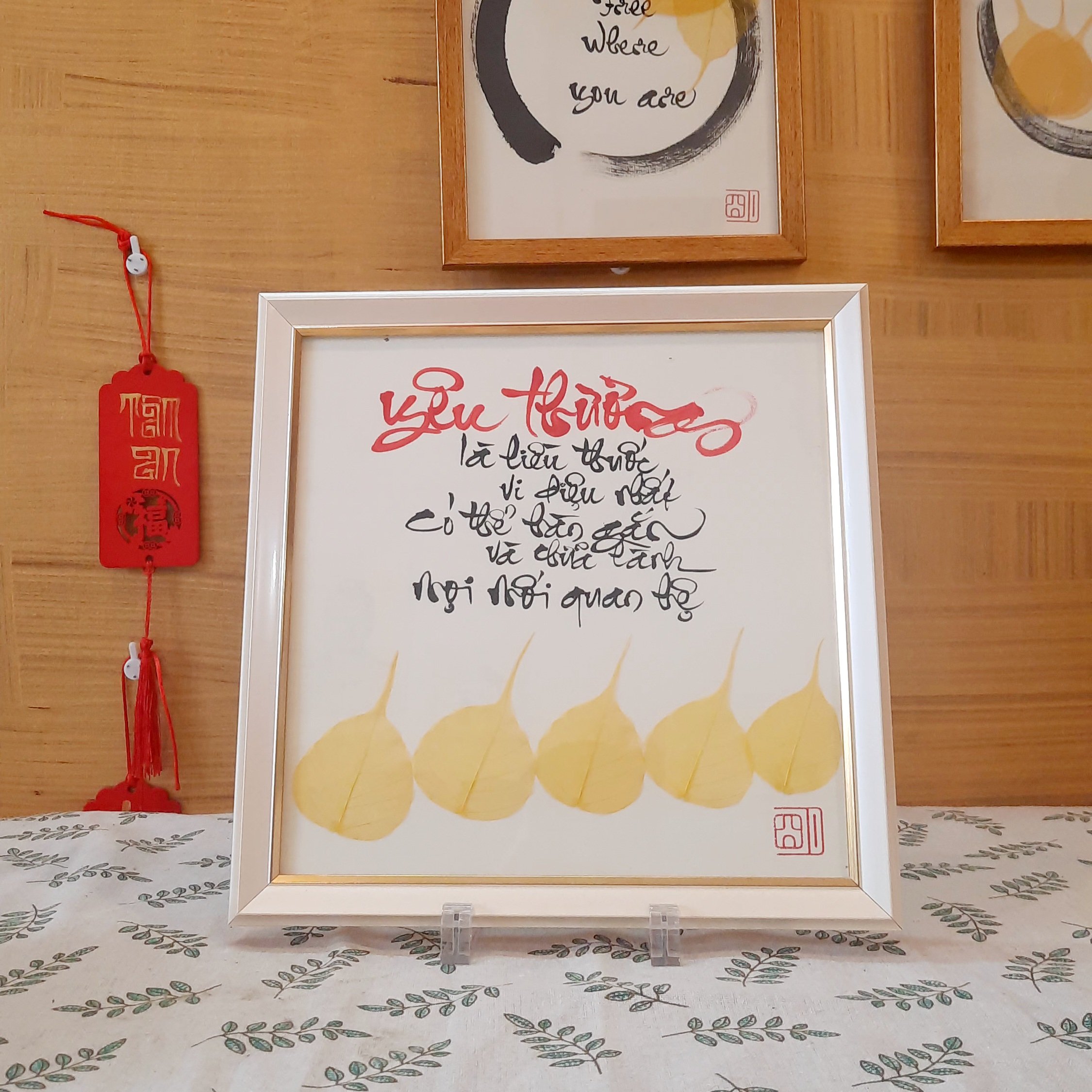 Sự kết hợp giữa thư pháp và lá bồ đề là một món quà ý nghĩa để dành tặng người thân, bạn bè, đối tác, và để trưng bày nơi phòng làm việc, phòng khách, chỗ thờ tự rất đẹp, ý nghĩa