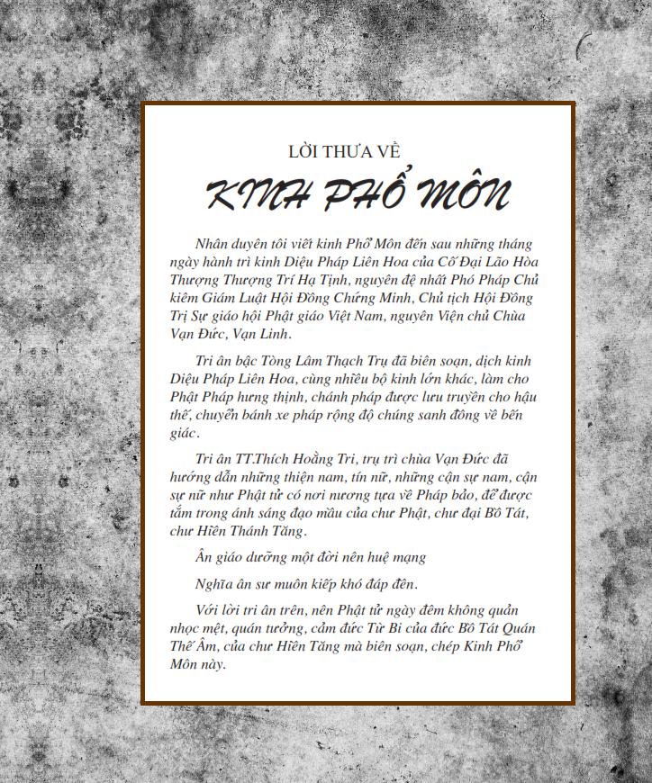 Với lời tri ân trên, nên Phật tử ngày đêm không quản nhọc mệt, quán tưởng, cảm đức Từ Bi của đức Bồ Tát Quán Thế Âm, của chư Hiền Tăng mà biên soạn, chép Kinh Phổ Môn này.