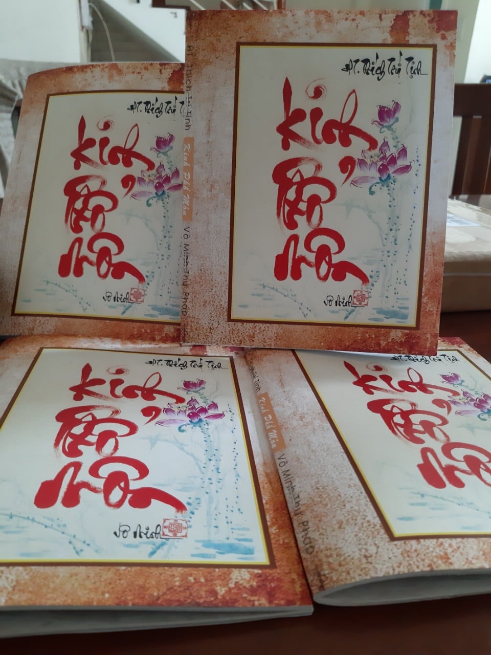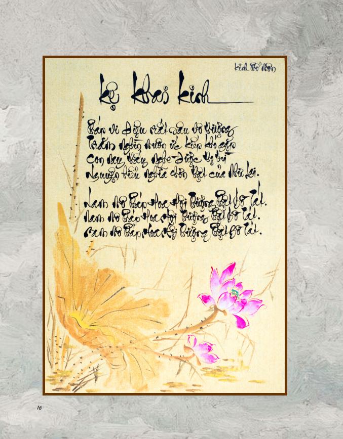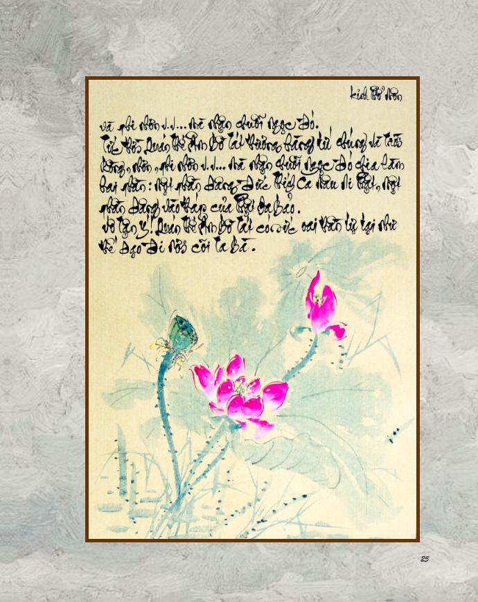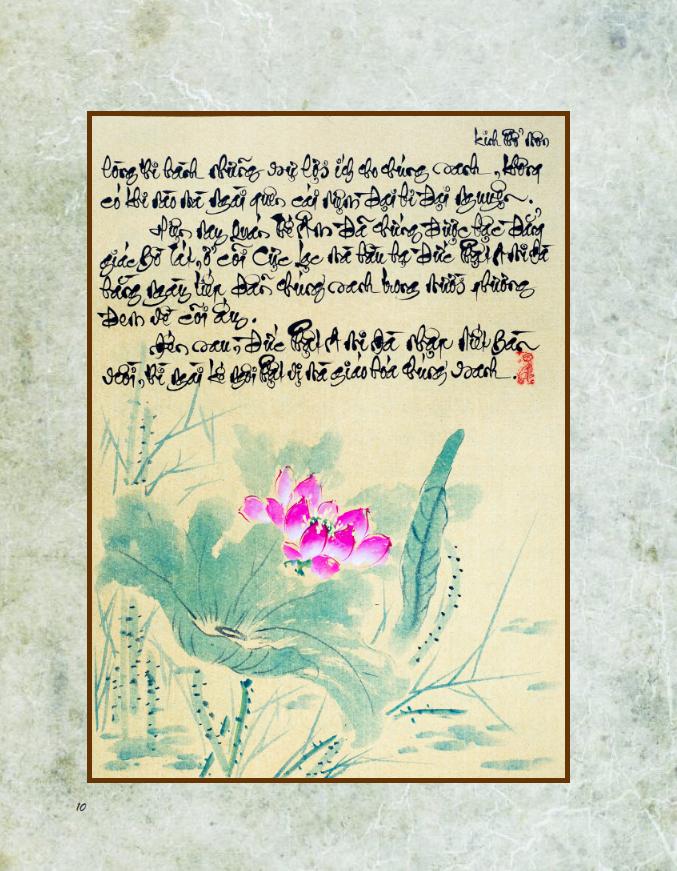 Xin được chân thành cám ơn sư huynh La Hán Vinh đã không quản nhọc mệt ép lụa, vẽ các hình sen đẹp trong kinh, làm cho kinh được thêm phần Trang Nghiêm, Tinh Khiết, bừng nở đóa liên hoa.