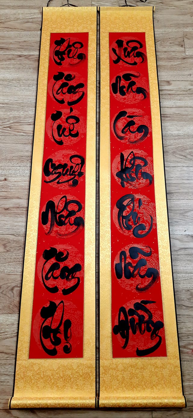 Liễng thư pháp TẾT câu đối 7 chữ là sản phẩm được yêu thích, là một món quà ý nghĩa ngày Tết, quà tặng ngày Tết. Kích thước liễn là 24x155 cm. Viết chữ, tư vấn câu đối theo yêu cầu. 1 cặp liễn câu đối XUÂN, nền đỏ lụa vàng, 7 chữ, nội dung: