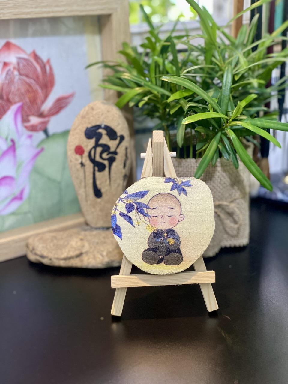 - Miếng gỗ được thiết kế thành hình chú tiểu chibi Uống Trà để bàn treo, mang lại vẻ đáng yêu và ngộ nghĩnh cho phòng khách của bạn.
